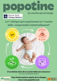 Depuis novembre, notre maternité Clinique Belharra est la première en France à expérimenter pendant 6 mois les couches Popotine, des couches compostables industriellement, une solution plus respectueuse de la santé des enfants et de l'environnement.